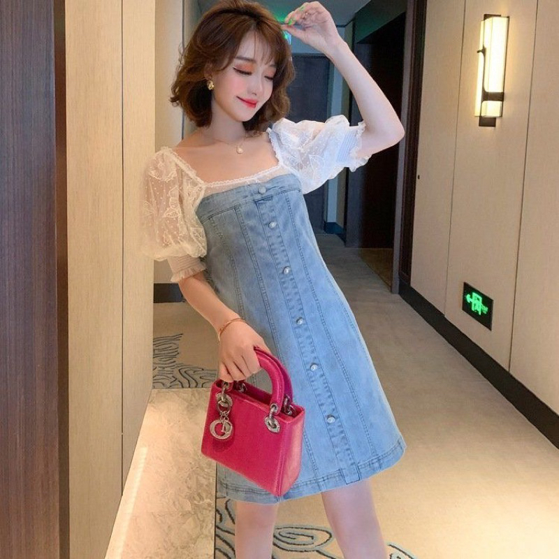 Pakaian Wanita > Denim > Dress Denim > Square Neck Bubble Sleeve Denim Dress M408