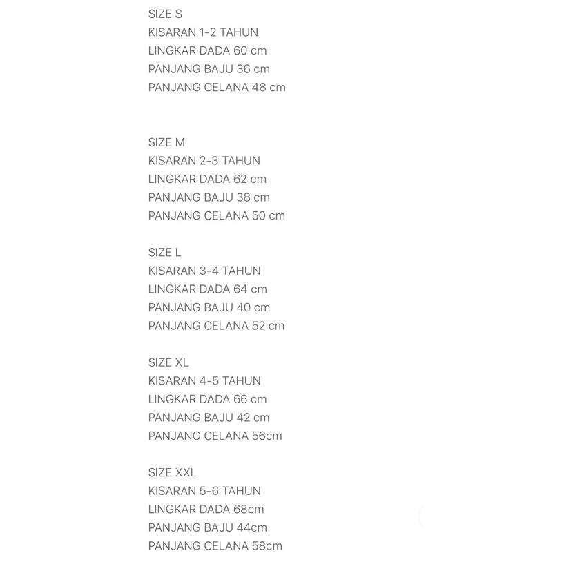 SIZE S KISARAN 1-2 TAHUN LINGKAR DADA 60 cm PANJANG BAJU 36 cm PANJANG CELANA 48 cm