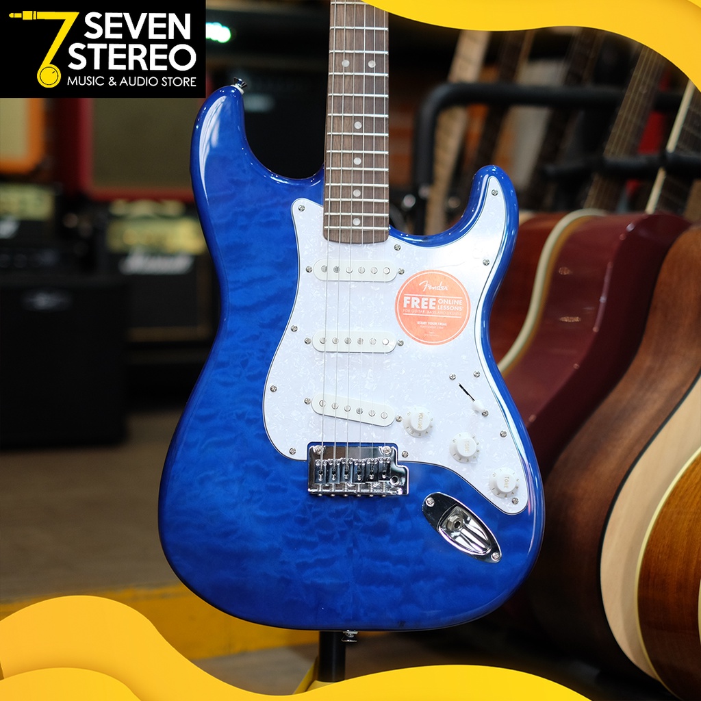 A superb gateway into the time-honored Fender® family, the Squier® Affinity Series™ Stratocaster® QMT delivers legendary design and quintessential tone for today’s aspiring guitar hero. This Strat® features several player-friendly refinements such as a thin and lightweight body with an eye-catching quilted maple top (QMT), a slim and comfortable “C”-shaped neck profile, a 2-point tremolo bridge for superior tremolo action, and sealed die-cast tuning machines with split shafts for smooth, accurate tuning and easy restringing. Loaded with three Squier single-coil pickups for genre-defying sonic variety, this model is ready to accompany any player at any stage.