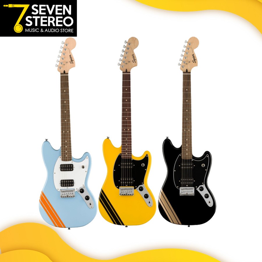 Body Shape: Mustang® Body Material: Poplar Body Finish: Gloss Polyester Neck Profile: "C" Shape Fretboard Material: Indian Laurel Fretboard Radius: 12" (305 mm) Scale Length: 24" (610 mm) No. of Frets: 22 Narrow Tall Fretboard Inlays: Pearloid Dot Pickups: Squier® Ceramic Humbucker (Bridge), Squier® Ceramic Humbucker (Neck) Bridge: 6-Saddle Hardtail Pickguard: 3-Ply White Strings: Fender® USA 250L Nickel Plated Steel (.009-.042 Gauges), PN 0730250403 Tuning Machines: Standard Die-Cast Hardware Finish: Chrome