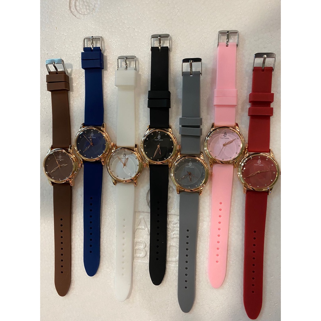 Deskripsi: - Brand: HUSH PUPP1ES - Band Material : KARET - Movement : ANALOG - Case diameter : 3.3 CM - Case thickness : 1.2 CM - Band width : 2 CM - Band Length : 24 CM - Water resistance : NO
