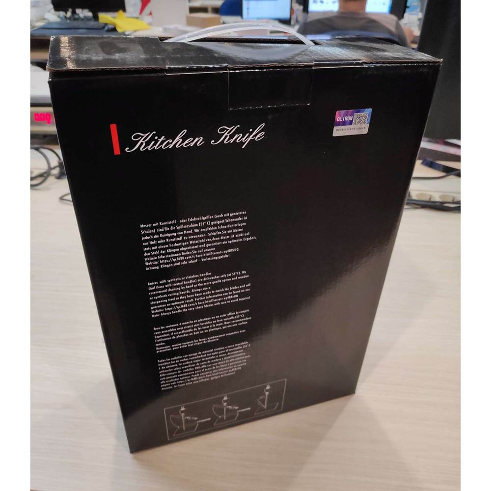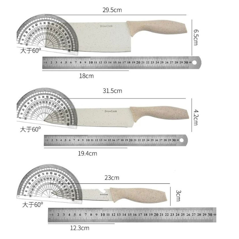 Spesifikasi Material Pisau/Gunting: 3CR13 stainless steel Pengupas Buah: Keramik Dimensi Panjang Total Pisau Cleaver: 29.5 cm Pisau Dapur: 31.5 cm Pisau Buah: 23 cm Gunting: 21.2 cm Pengupas Pisau: 16.9 cm Holder Pisau: 24.5 cm