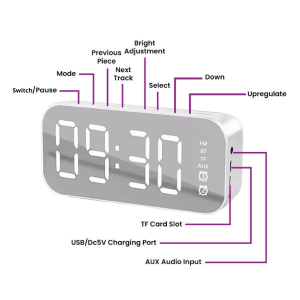DESKRIPSI : • Dilengkapi LED Jam Display • 3 level tingkat kecerahan yang mudah diatur • Menggunakan Bluetooth Versi 5.0 • Transmisi lebih cepat dan stabil • Mendengarkan musik tanpa tersendat ataupun delay • Didukung dengan fitur Dual Smart Alarm • Mengatur 2 alarm sekaligus sesuai dengan kebutuhan • Dapat memutar lagu selama 5 jam non-Stop • Memudahkan dalam mengangkat dan menutup telephone • Dapat digunakan sebagai Radio • Play Music Hingga 5 Jam Non Stop • Support charging Micro USB • Support SD Card, Bluetooth & micro USB • Layar LED model Cermin • Saat jam dimatikan, layar dapat dipakai sebagai cermin rias • Ukuran layar cukup besar