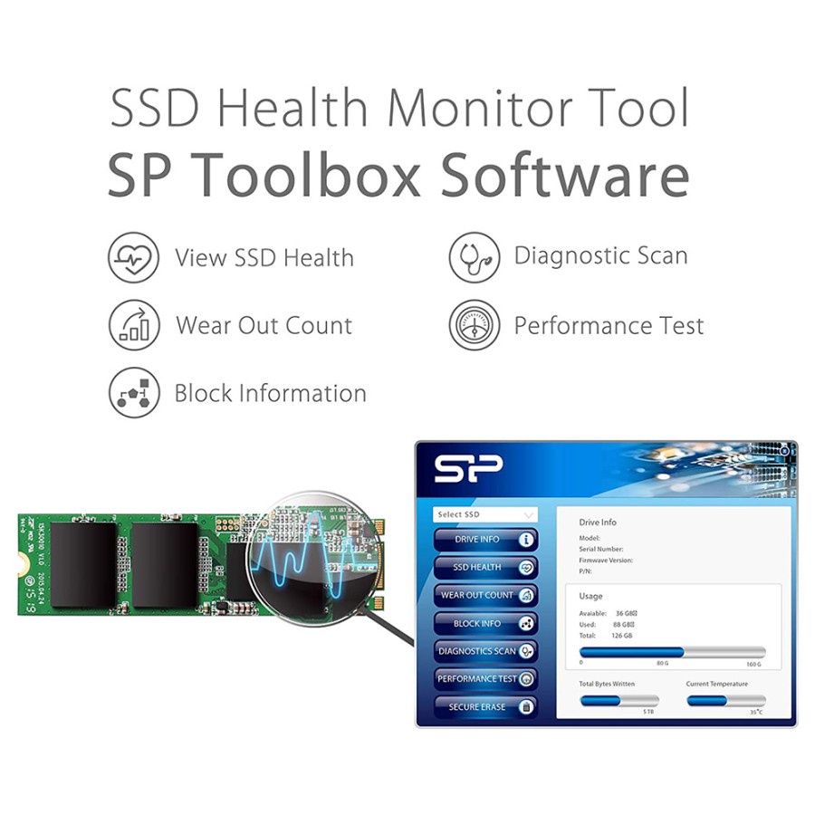 FITUR UTAMA • Mengadopsi 3D NAND flash dan "teknologi SLC Cache" untuk meningkatkan kinerja secara keseluruhan • M.2 (NGFF) design suitable untuk ultrabooks, tablet dan PC • 15x lebih cepat dari HDD 5400 standar dengan interface SATA III 6Gb/s • Supports Intel® Smart Response Technology (ISRT) • Mendukung perintah TRIM dan teknologi Garbage Collection • NCQ dan RAID ready • Teknologi ECC menjamin transmisi data yang andal • S.M.A.R.T. sistem pemantauan • Konsumsi daya rendah • Free download SP ToolBox untuk memperoleh informasi disk dengan mudah seperti laporan analisis self-monitoring, tingkat konsumsi, dan diagnostik SSD