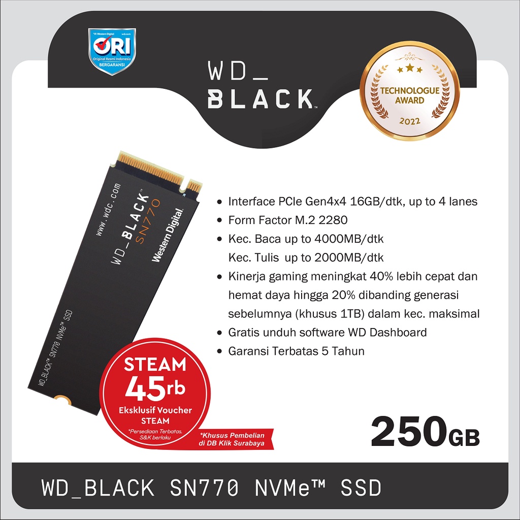 Spesifikasi Lengkap Capacity : 250 GB Form Factor : M.2 2280 Interface : PCIe Gen4 x4 Sequential Read Performance : 4000MB/s Sequential Write Performance : 2000MB/s Random Read : 2400004KB IOPS Random Write : 4700004KB IOPS Kompatibilitas : Persyaratan Sistem • Komputer dengan port M.2 (M-key), yang mampu menampung faktor bentuk M.2 2280 • Windows® 11, Windows® 10, Windows® 8.1 Catatan: Kompatibilitas dapat bervariasi bergantung pada konfigurasi perangkat keras dan sistem operasi pengguna. Dimensi (L x W x H) : 80mm x 22mm x 2.38mm Di Dalam Kotak : WD_BLACK SN770 NVMe SSD