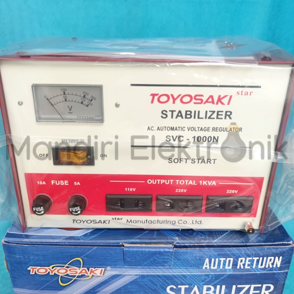 Spesifikasi : - Merek : Toyosaki - Heavy Duty Automatic Voltage Regulator - Tipe : SVC-1000N - Kapasitas : 1 kVA ~ 800 Watt - Sekering : Sekering 5A - Berat Netto : ± 4.4 Kg - Dimensi : 240 x 240 x 190 mm