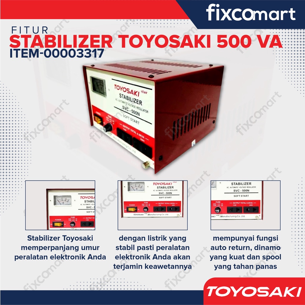 Stabilizer Toyosaki memperpanjang umur peralatan elektronik Anda, dengan listrik yang stabil pasti peralatan elektronik Anda akan terjamin keawetannya. Stabilizer Toyosaki mempunyai fungsi auto return, dinamo yang kuat dan spool yang tahan panas.