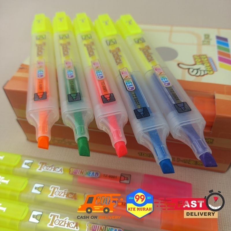 detail produk: - highlighter 2 warna -merk tozhca dan esco - dua warna berbeda - isi 12 pcs(harga sudah grosir) - warna pink,ungu,orange,hijau,biru,toska