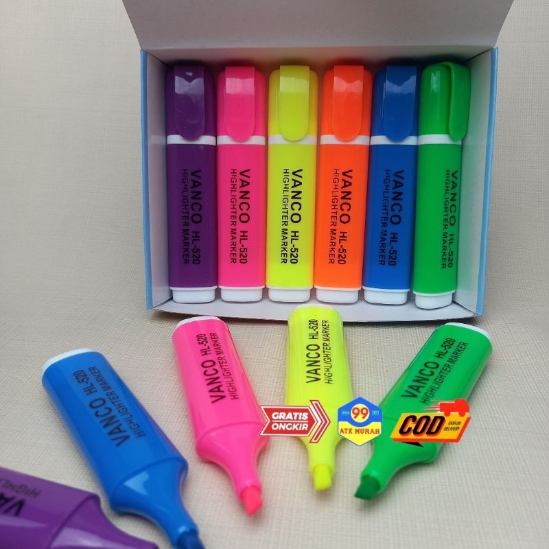 detail produk: - highlighter pen warna -merk VANCO & V-TRO - warna berbeda - isi 10 pcs(harga sudah grosir)