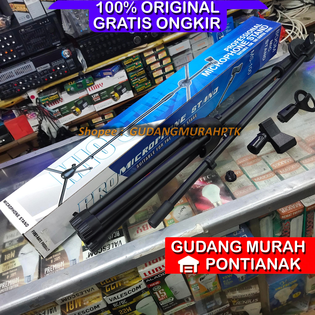 BLACK SPIDER Tripod Holder Mikrofon MS100 ORIGINAL Stand untuk menaruh mikrofon sehingga anda tidak perlu memegang mikrofon terus menerus. Sangat cocok untuk penggunaan di dalam studio. Stand ini dapat di sesuaikan ketinggian nya sesuai dengan kebutuhan. Features Microphone StandAnda dapat menaruh 2 buah mikrofon handheld anda pada bagian penyangga stand, sehingga anda tidak perlu memegang mikrofon terus menerus pada saat penggunaannya. Anda dapt mengatur ketinggian dari stand ini dan mengunci posisi yang sesuai dengan knop kunci yang tersedia. Tripod Stand mikrofon ini memiliki 3 buah kaki yang sama panjang dan dapat di atur sehingga stand selalu seimbang dan tidak membuat mikrofon yang di pasangkan terjatuh. Disertai dengan knop yang berfungsi untuk mengunci posisi kaki tripod. Adjustable Microphone Position Anda dapat mengatur posisi sudut kemiringan yang tepat pada bagian penyangga untuk penggunaan mikrofon.Dapat di putar sampai dengan 360 derajat. Good Quality MaterialStand mikrofon terbuat dari material metal pada bagian kaki stand dan plastik berkualitas pada bagian badan dan penyangga mikrofon. Bagian ujung kaki stand di lapisi dengan plastik anti-slip yang membuat tripod berdiri kokoh. Package Content Barang-Barang yang Anda dapatkan dari dalam kotak produk: 1 x Mikrofon Tripod Stand 2 x Mikrofon Klip Material Metal, Plastik Dimensi Adjustable Height: 80 - 160 cm