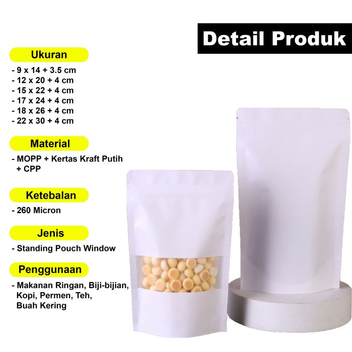 Detail Standing Pouch White Kraft Paper Bag Window Kemasan Plastik Klip