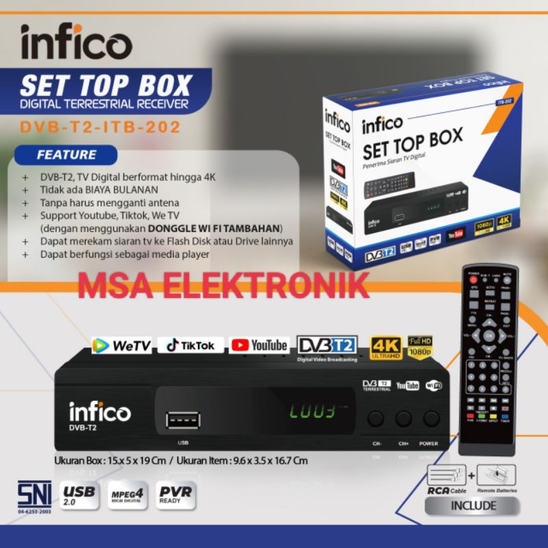 Fitur: - Menggunakan Antena UHF, pakai Antena lama anda (antena TV Biasa) - Gambar tanpa semut atau bayang. Kualitas gambar setara TV Kabel berlangganan dan sangat stabil. - HDMI, RCA, dan RGB (Sebaiknya beli dan gunakan HDMI untuk TV LED/LCD/Plasma) - Bisa Dipakai di SEMUA JENIS DAN MERK TV TABUNG, LCD, LED, Plasma - Bisa Merekam Siaran TV (tinggal colok flashdisk atau HDD eksternal) - Bisa menjadi media player untuk film, foto, dan musik. - Format yang bisa dimainkan: MKV, AVI, MP4, MPG, VOB, TS, TRP, DAT, JPEG, JPG, BMP, MP3, WAV, OGG - Teknologi EWS (Early Warning System/Peringatan Bencana Dini) - Body dari bahan metal