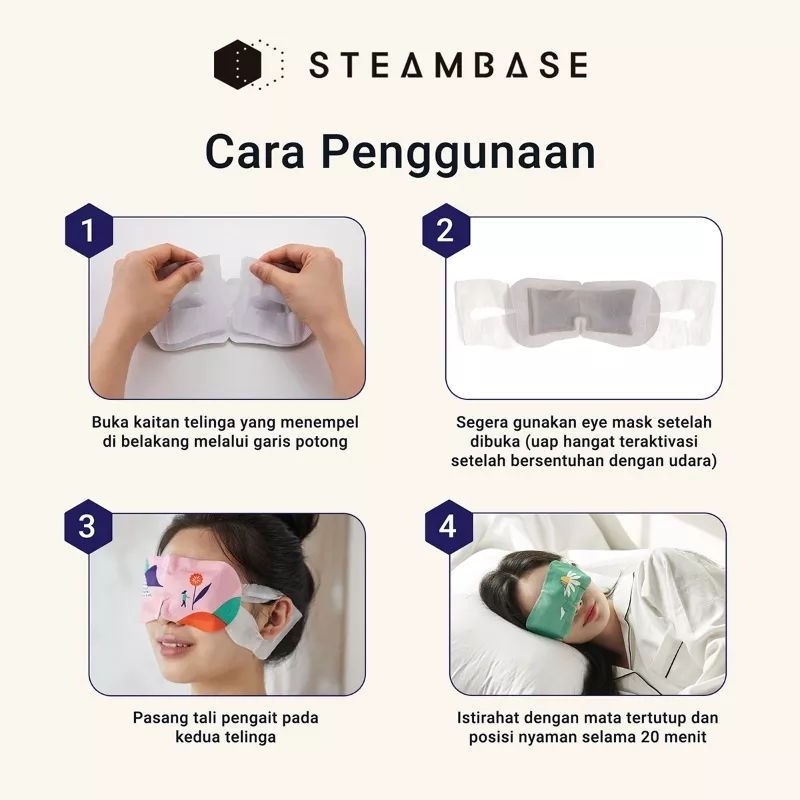 Cara kerja Steambase Warming Eyemask: Unit pemanas berbentuk blok yang terdapat di dalam eyemask akan bekerja saat bereaksi dengan oksigen untuk menghasilkan dan mengalirkan panas ke mata dengan aman secara merata dan konsisten. Uap hangat (40°C) yang dihasilkan lalu akan mengembangkan eyemask agar cocok dipakai untuk semua jenis kontur wajah.