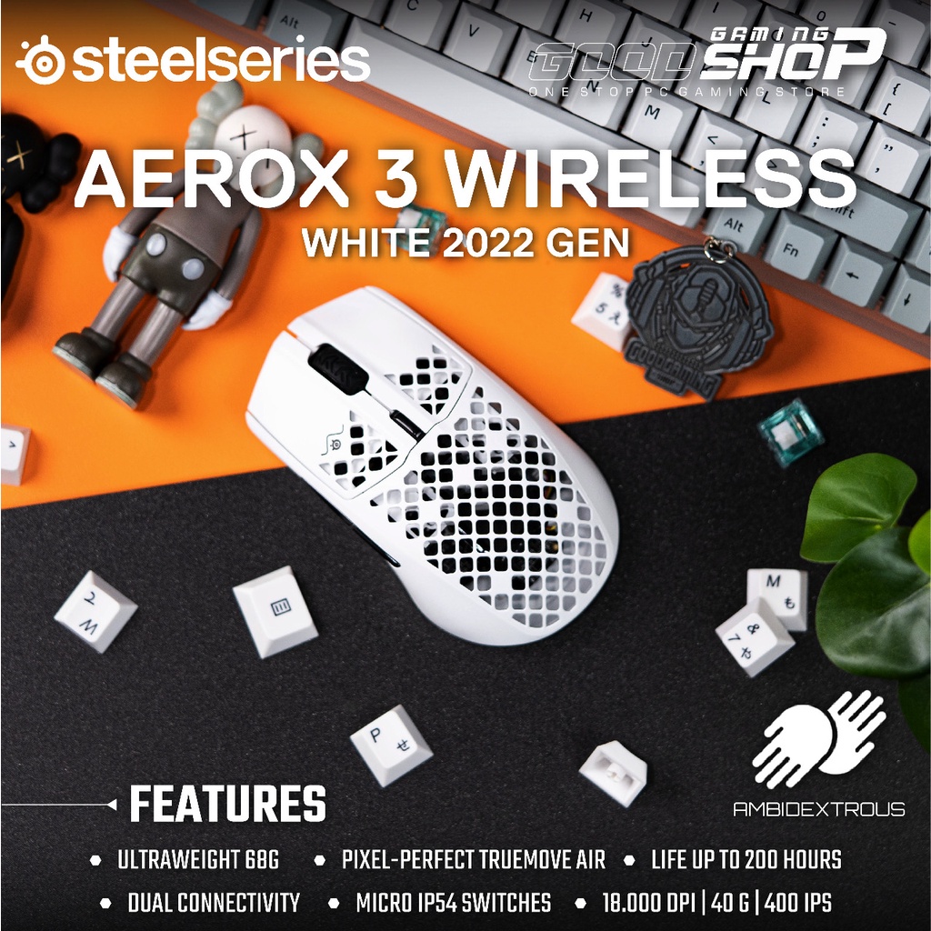 Ultra lightweight 68g design for effortlessly fast gameplay Optimized 200 hour battery life plus USB-C fast charging Dual connectivity via gaming-grade 2.4 GHz and multi-purpose Bluetooth 5.0 Pixel-perfect TrueMove Air optical gaming sensor AquaBarrier™ for water resistance and protection from dust and more IPS 400, on SteelSeries QcK surfaces CPI 100–18,000 in 100 CPI Increments Sensor Type Optical Sensor SteelSeries TrueMove Air Acceleration 40G Polling Rate 1000Hz / 1 ms Hardware Acceleration None (Zero Hardware Acceleration) OS Windows, Mac, Xbox, and Linux. USB port required. Shape Ergonomic, Right-Handed