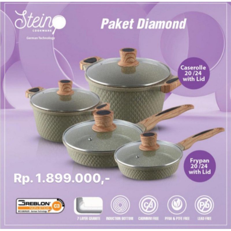 Diamond Granit German Series ♦️Paket Diamond (complete set) . 💎Caserolle 20 Cm + Lid 💎Caserolle 24 Cm + Lid 💎Frypan 20 cm + Lid 💎Frypan 24 cm + Lid . Spesifikasi: ✅7 Lapis Granit German ✅PFOA FREE ✅Lead Free ✅Cadmium Free ✅Anti Lengket ✅Baby Friendly . Material paling Top, tidak ada yang lebih premium lagi dari segi material. Top Specs. Wajib Punya moms, bisa disimpan juga untuk cadangan ya. Ingat, kalo sudah masak pakai Granit, gak mungkin balik lagi ke teflon ya, harus ada Cadangan ya.