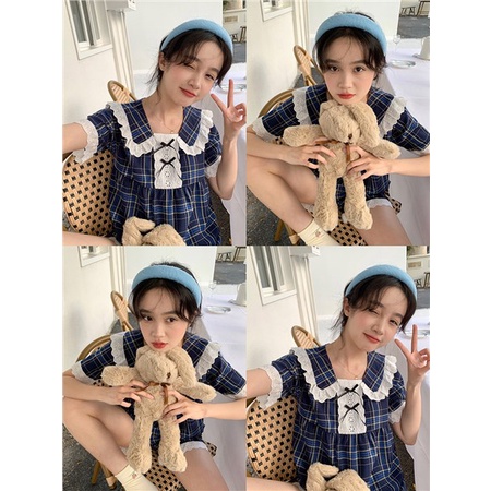 ™stelan baju tidur wanita Xinbangbang Homedress cute doll collar short-sleeved homewear set student plaid pajamas women summer #COD baju tidur wanita bahan kaos