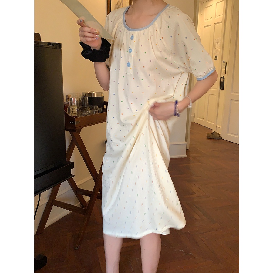 Pakaian Wanita > Pakaian Tidur & Piyama > Piyama > ஐ►✙stelan baju tidur wanita Xinbangbang Homedress Contrasting Color Polka Dot Cute Nightdress Short Sleeve Breathable Texture Home Dress Pyjamas Women Summer #COD baju tidur wanita bahan kaos