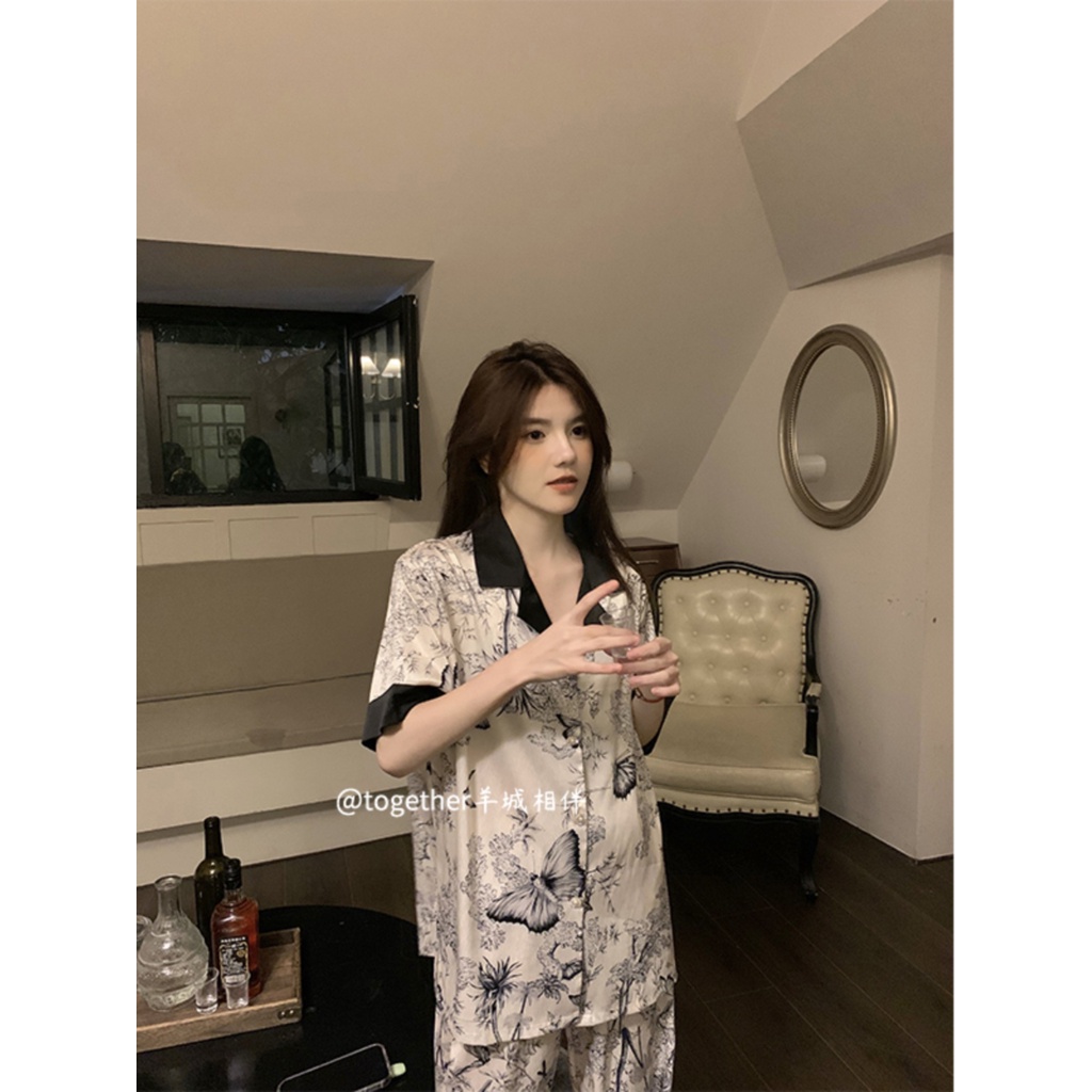Pakaian Wanita > Pakaian Tidur & Piyama > Piyama > ✸Stelan baju tidur wanita pajamas summer women s comfortable silk skating silk short-sleeved trousers national style high-end butterfly ink painting home service set #COD baju tidur wanita bahan kaos