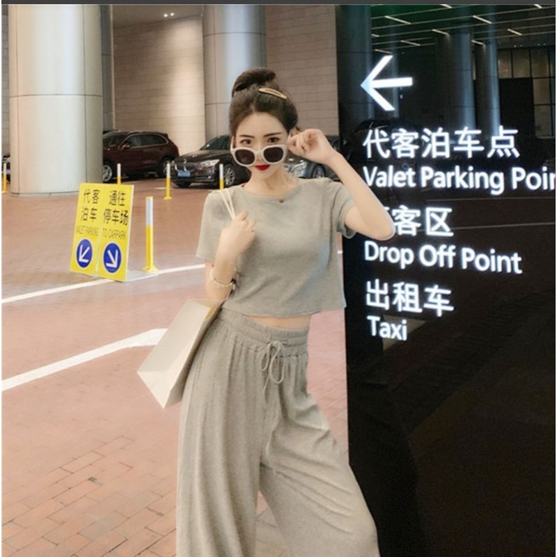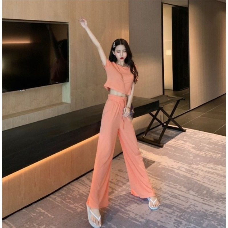Detail Setelan Wanita Premium Crop Top dan Celana Bahan Adem Modis Elegan