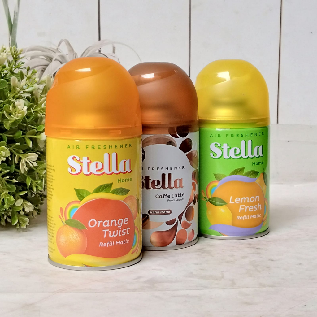 Stella Refill Matic 225ml Stella Refill Matic adalah inovasi terbaru dari Stella pengharum ruangan yang memberikan suasa menyegarkan. * Petunjuk Penggunaan: - Pastikan tombol pengatur waktu pada alat dalam keadaan off - Buang kaleng yang kosong dan masukan kaleng refill yang baru - Putar tombol pengaturan waktu sesuai dengan interval yang diinginkan dan nyalakan tombol On pada alat - Jangan gunakan alat ketika posisi menghadap ke wajah - Dapat digunakan untuk refill alat lain yang sejenis * Varian Yang Tersedia : - Orange Twist - Lemon Fresh - Coffe Latte