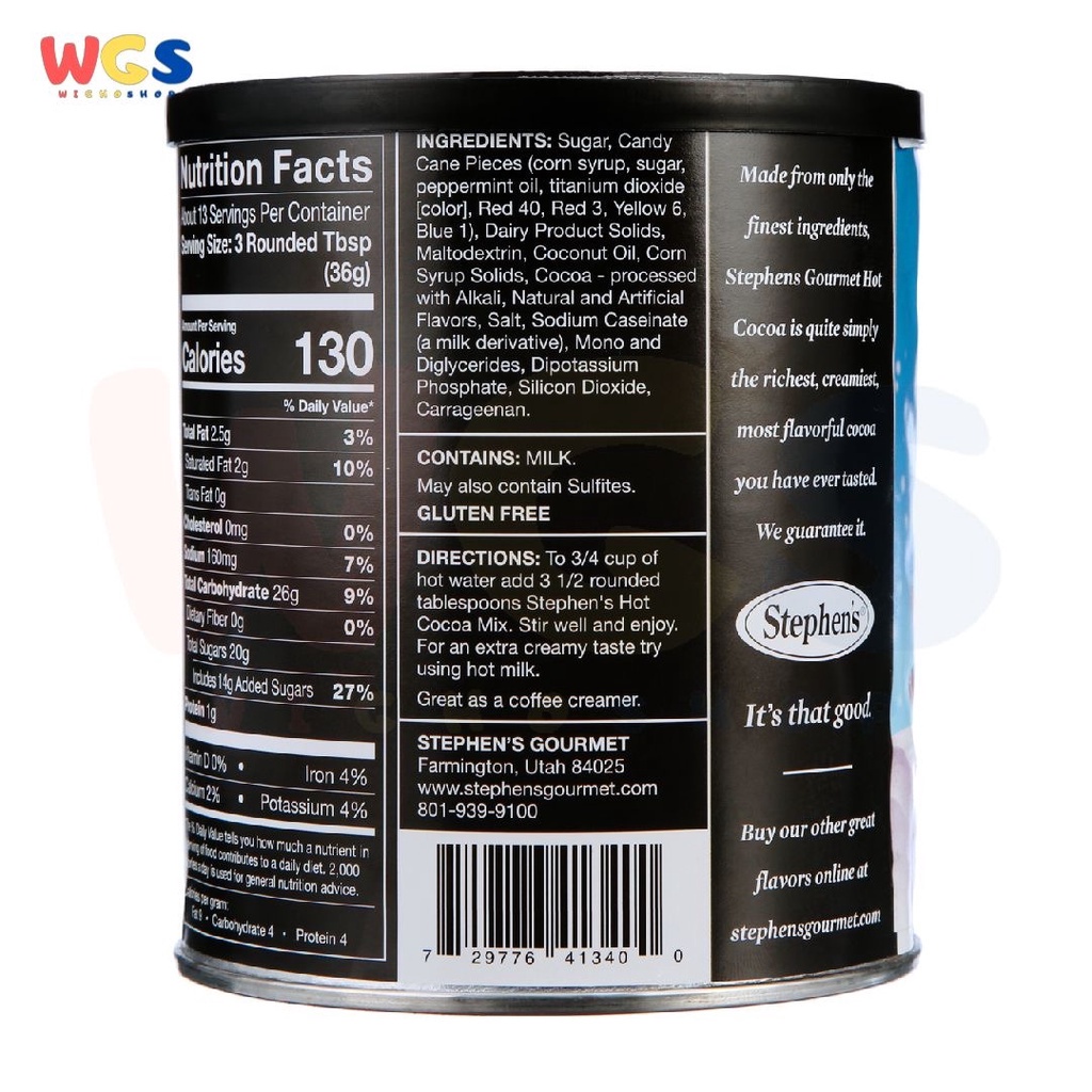 Stephen's Candycane Cocoa comes in a handy canister that allows for easy storage when not in use. It has a fresh blend that can make a sweet dessert option any day of the week. This cocoa can also make a thoughtful gift for a friend or loved one who enjoys decadent treats. It's simple to prepare so you can enjoy a fresh cup whenever you get thirsty for something sweet. Rich, creamy consistency Stephen's Candycane Hot Cocoa contains 170 calories per serving