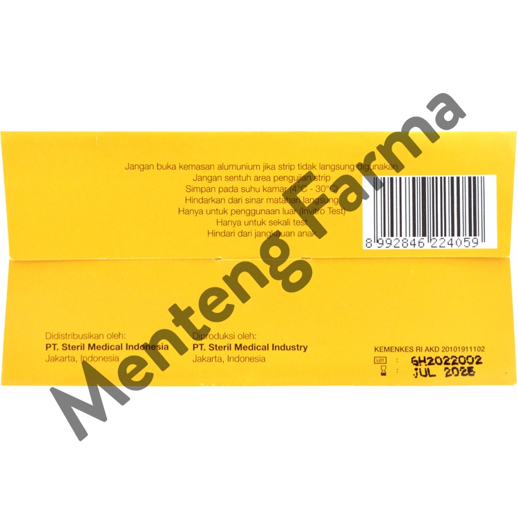 Perhatian : - Jangan buka kemasan alumunium jika strip tidak langsung digunakan - Jangan sentuh area pengujian strip - Simpan pada suhu kama 4o C - 30o C - Hindarkan dari sinar matahari langsung - Hanya untuk penggunaan luar (Invitro Test) - Hanya untuk sekali test - Hindari jangkauan anak