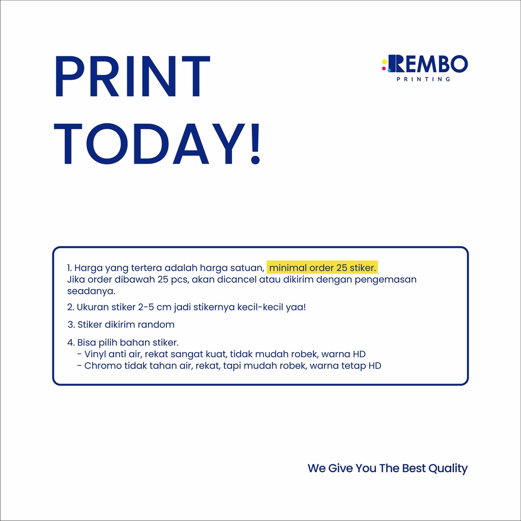 Demi kenyamanan anda saat bertransaksi dengan kami silahkan ikuti petunjuk berikut ini: 1. Silahkan klik beli biasa seperti pada saat anda membeli barang di shopee, kemudian lakukan pembayaran. 2. Silahkan tulis pada catatan untuk penjual seperti : Nomor template, Tulisan yg dicantumkan, Sosmed yang dicantumkan. Jika ingin menggunakan file sendiri bisa dikirim melalui email rembostore2@gmail.com dengan Subject : Nomor Invoice Pemesanan. 3. Warna hasil print dengan dimonitor tidak selalu 100% sama, dikarenakan faktor dari profil warna dalam mendesain, karakteristik bahan, dan lain sebagainya. 4. Jika ada yang ingin ditanyakan bisa hubungi kami via chat