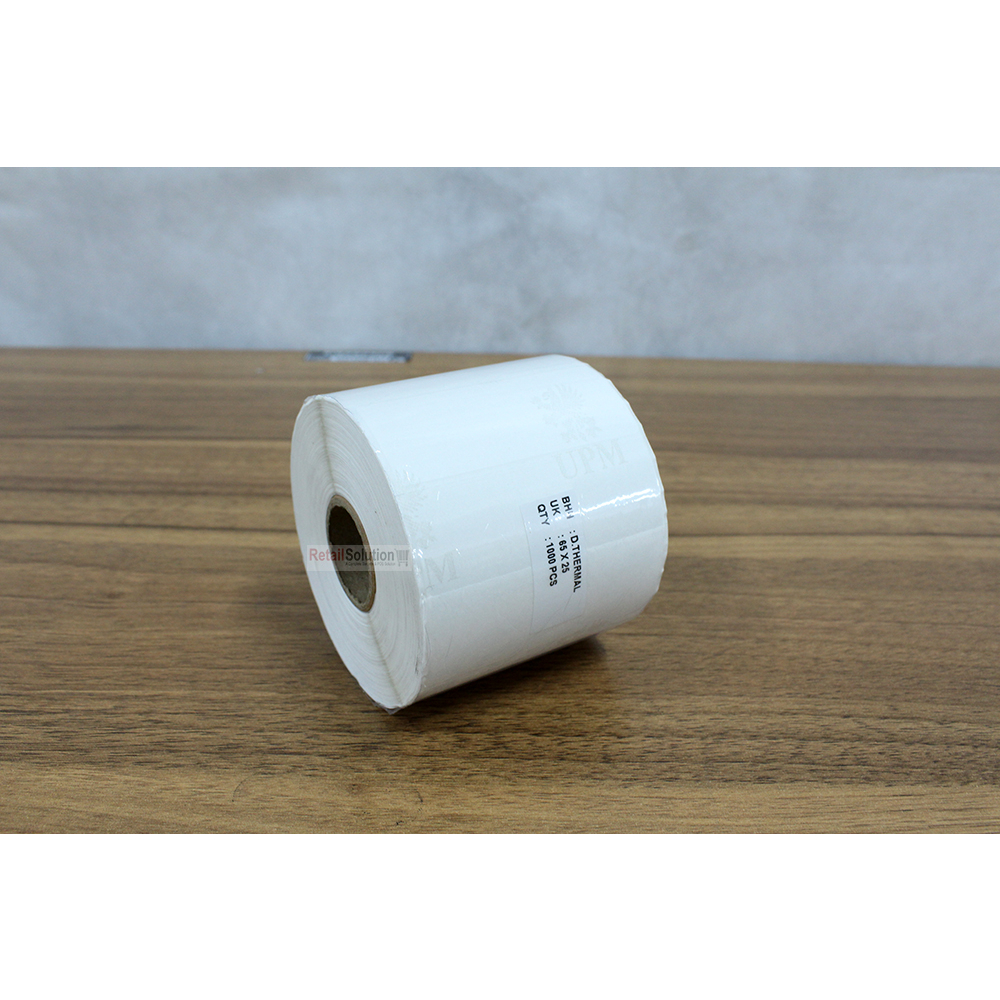 Harga per Roll, Isi 1.000 lembar Ukuran P Horizontal 6.5CM x L Vertical 2.5CM Bahan Thermal (Tidak Perlu pakai Ribbon) 1 Kolom per baris 1" Core Porforasi (Garis sobek tiap baris) Cocok untuk Stock Produk, Tag Pakaian, Tag Harga, Barcode, dll