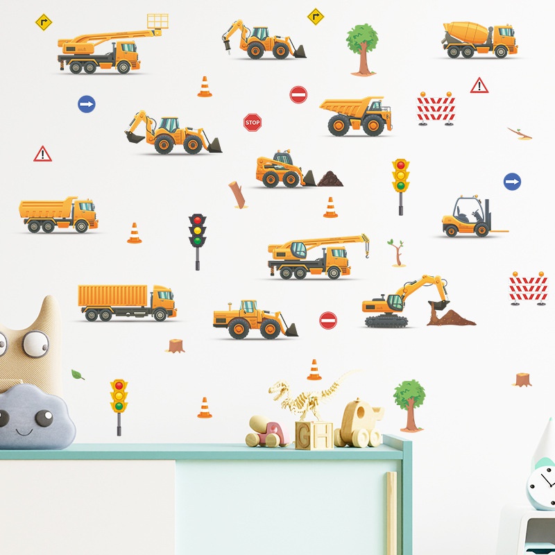 Detail Stiker Dinding Decal Desain Kartun Excavator Crane Lampu Lalu Lintas Untuk Kamar Anak