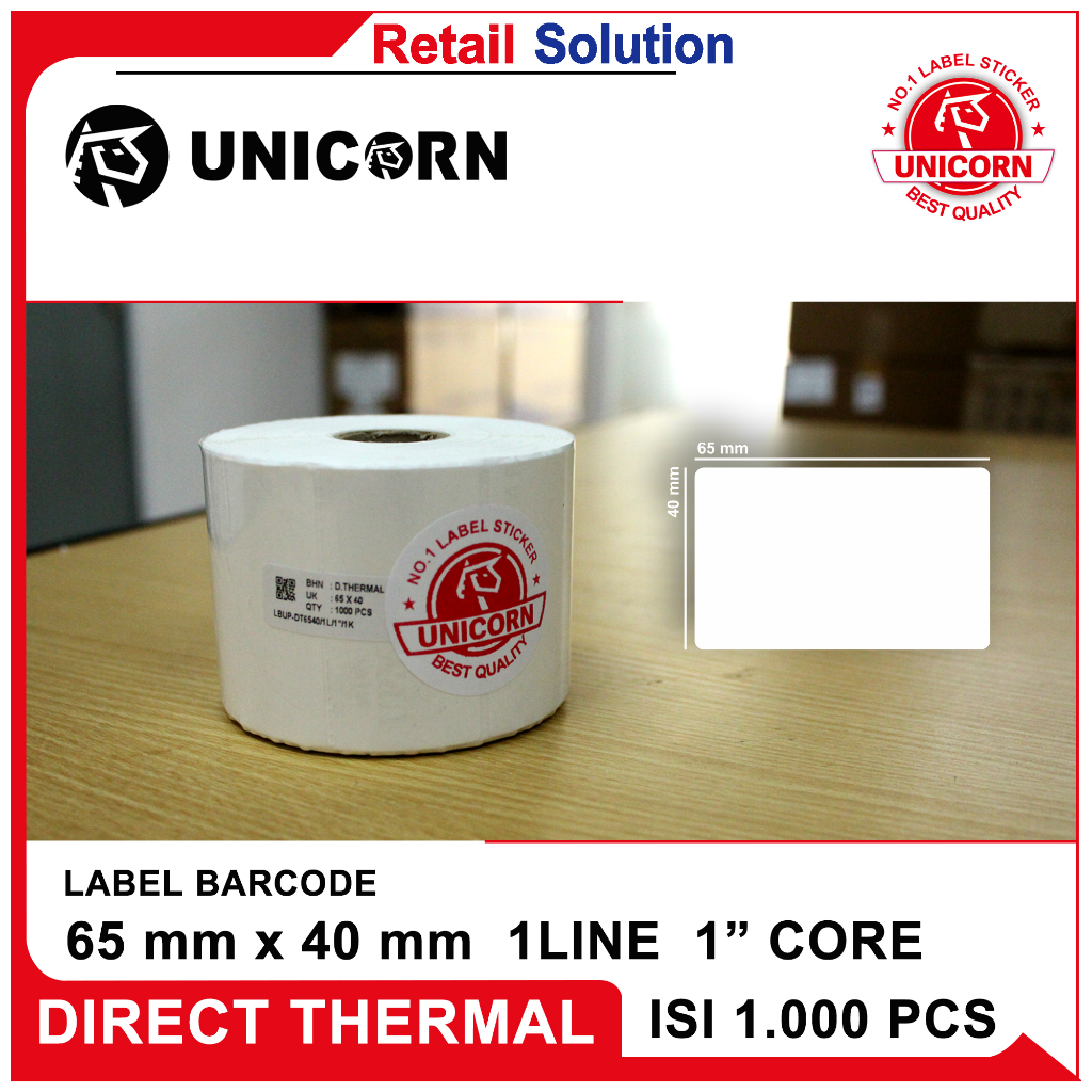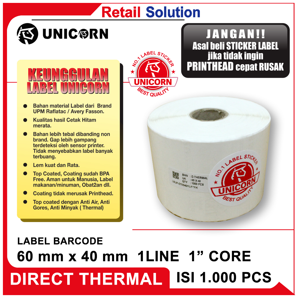 Keunggulan Label Unicorn: 1. Bahan material dari Brand UPM Raflatac / Avery Fasson. 2. Hasil Cetaknya bagus dan merata 3. Bahan lebih tebal dibanding non brand. Gap mudah terdeteksi oleh sensor printer. Tidak menyebabkan label banyak terbuang. 4. Lem kuat dan Rata. 5. Top Coated, Coating sudah BPA Free. Aman untuk Manusia, Label makanan/ minuman, Obat dll. 6. Coating tidak merusak Printhead. 7. Top coated dengan Anti Air, Anti Gores, Anti Minyak ( Khusus Varian Thermal)