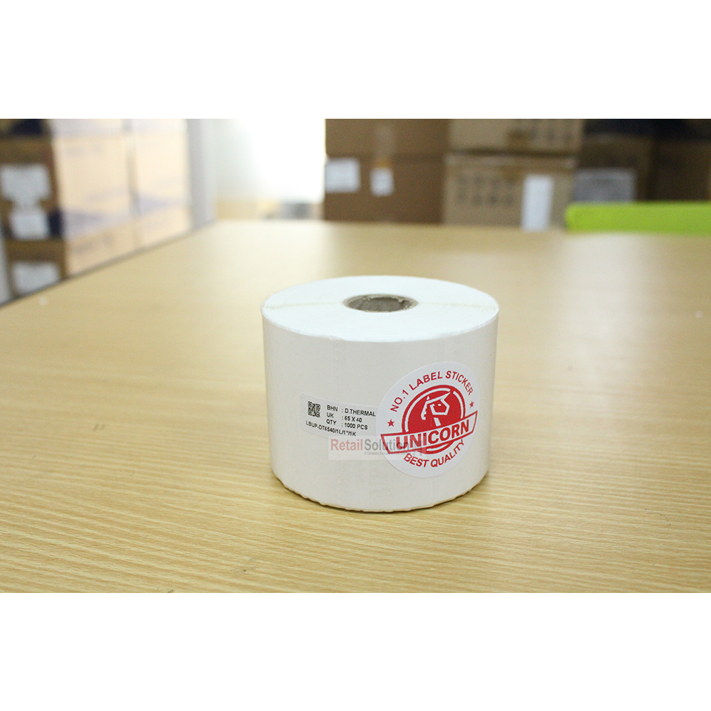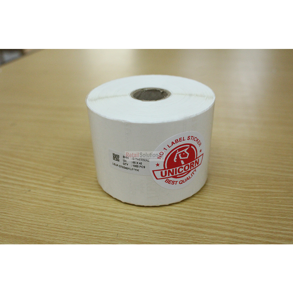 Harga per Roll, Isi 1.000 lembar Ukuran P Horizontal 6.5CM x L Vertical 4CM Bahan Thermal (Tidak Perlu pakai Ribbon) 1 Kolom per baris 1" Core Porforasi (Garis sobek tiap baris) Cocok untuk Stock Produk, Tag Pakaian, Tag Harga, Barcode, dll
