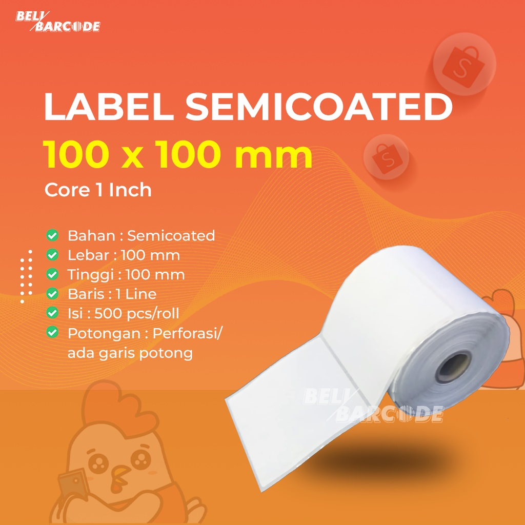 Informasi Produk : - Bahan : Semicoated - Lebar : 100 mm - Tinggi : 100 mm - Baris : 1 Line - Isi : 500 pcs / roll - Core : 1 Inch (Kecil) - Perforasi / Ada Garis Sobek - Gap Kanan Kiri Atas Bawah - Harga diatas tercantum untuk 1 Roll label - Berat diatas tercantum untuk 1 Roll label