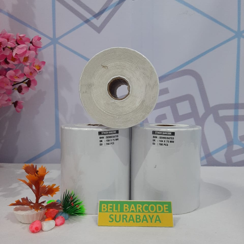 Informasi Produk : - Bahan : Semicoated - Lebar : 104 mm - Tinggi : 75 mm - Baris : 1 Line - Isi : 700 pcs / roll - Core : 1 Inch (Kecil) - Perforasi / Ada Garis Sobek - Gap Kanan Kiri Atas Bawah - Harga diatas tercantum untuk 1 Roll label - Berat diatas tercantum untuk 1 Roll label