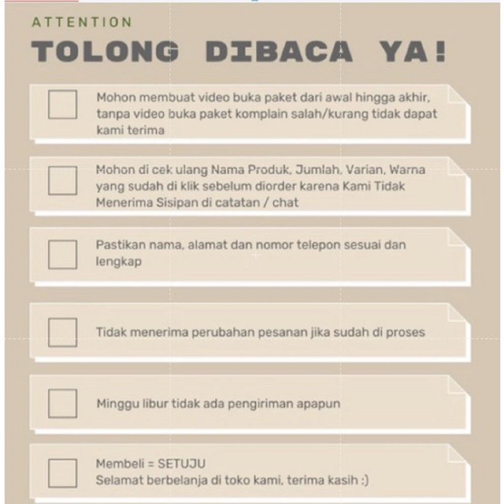 📢 PERATURAN TOKO: - Mohon buat Video Unboxing saat paket Diterima hingga SELESAI karena kami tidak menerima komplain jika ada barang yang rusak atau salah kirim tanpa Video Unboxing. - Jika ada kesalahan produk / kurang barang, Mohon lampirkan video unboxing, foto produk dan Label Pengiriman - Mohon untuk isi data Nama, Alamat, No Telp yang lengkap ( untuk memudahkan kurir menemukan alamat pembeli ) - Mohon di cek ulang Nama Produk, Jumlah, Varian, Warna yang sudah di klik sebelum diorder karena Kami Tidak Menerima Sisipan di catatan / chat
