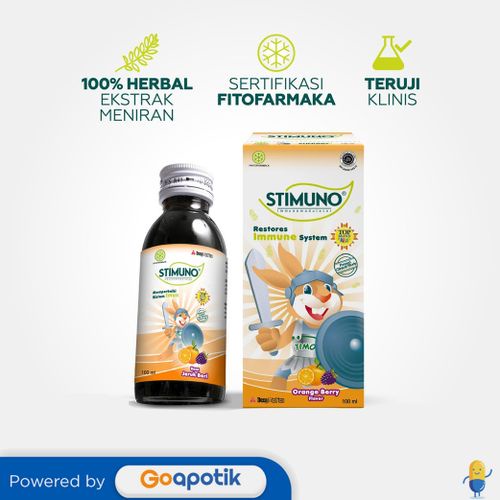 Deskripsi : Stimuno Sirup adalah penguat imun (imunomodulator) berbahan ekstrak Meniran (Phyllanthus niruri) untuk anak. Di Indonesia, Stimuno merupakan satu-satunya imunomodulator sudah mendapat Sertifikat Fitofarmaka dari BPOM dan Halal. Stimuno telah lulus uji coba klinis dapat meningkatkan fungsi sistem imun dan aman digunakan dalam jangka panjang. | Komposisi : Tiap 5 ml Stimuno Sirup mengandung 25 mg Ekstrak Kering Phyllanthus niruri (Meniran) | Dosis : Untuk pencegahan: 1 x 1 sendok takar (5 ml)/hari sesudah makan. Untuk pemulihan: 3 x 1 sendok takar (5ml)/hari sesudah makan | Indikasi : Memperkuat sistem imun tubuh, memperbanyak produksi antibodi sehingga kekebalan tubuh lebih kuat. | Perhatian Khusus : Stimuno tidak dapat digunakan apabila memiliki riwayat alergi terhadap Meniran atau komposisi dalam Stimuno. Tidak dianjurkan untuk digunakan pada anak <1 tahun. | Kemasan : Botol, 100 ml | NIE : FF172600721