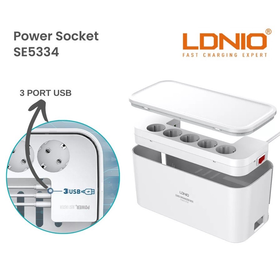 Detail Stop Kontak LDNIO SE5334 5 Socket 3 USB Port 5 Lubang 3 USB AUTO ID