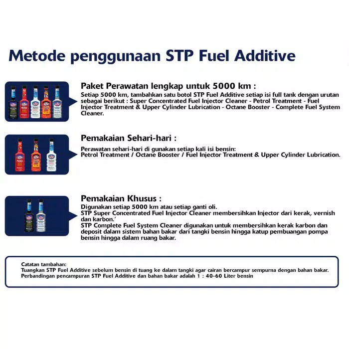 Cara pakai: - Tuangkan STP Petrol Treatment seluruhnya ke dalam tangki saat Anda mengisi bensin penuh. - Tambahkan setiap 2x Anda mengisi tangki penuh bensin. - Untuk 40-60 liter bensin. - STP Petrol Treatment dapat dicampur dengan “suplemen” bahan bakar lainnya dari STP.