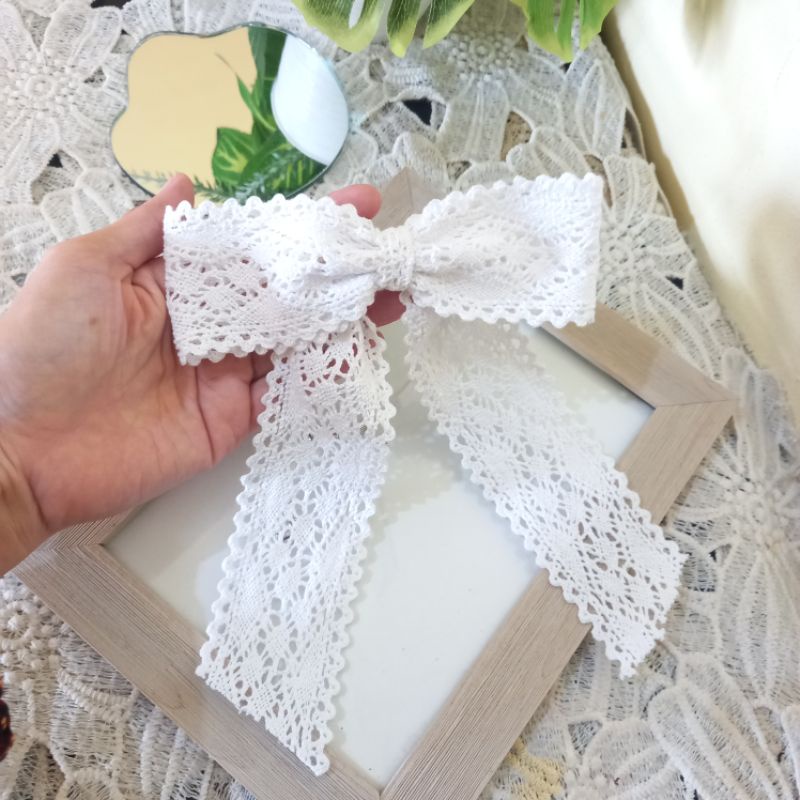 🎀 Pita ukuran besar, lebar 15cm panjang sekitar 20cm 🎀 Pita bahan renda lace / renda rajut 🎀 Tali panjang 20cm (bisa request panjang tali) 🎀 Tali elastis, bisa melar, nyaman dipakai 🎀 pengait berbahan besi model kokot udang