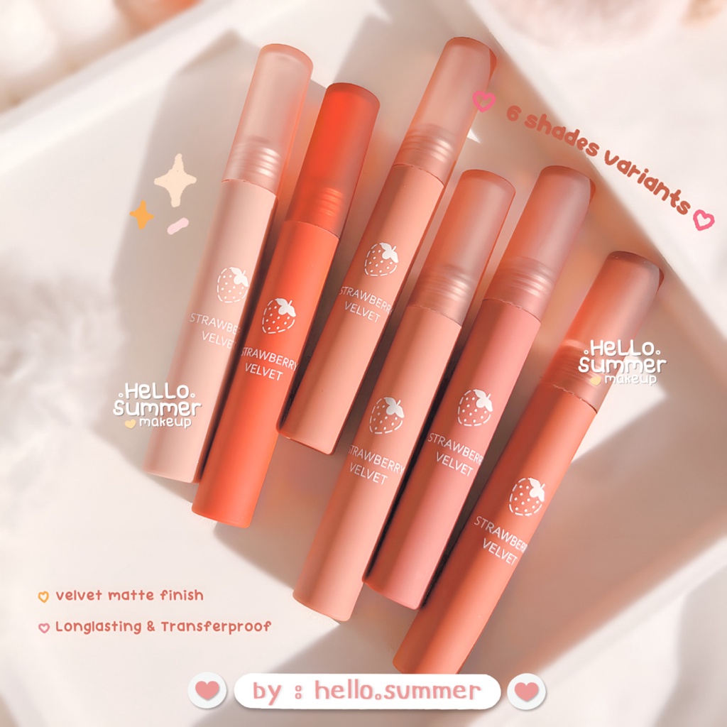 Strawberry Velvet Moisturaizing Matte Lipgloss Lipcream Lipstick Tahan Lama ㅤㅤ Model : ㅤMatte lipstick Finish : ㅤMatte Warna : ㅤ6 Color variants Isi : ㅤFull Size Berat : 36gr Exp Date : ㅤ01/2026 Masa Simpan : ㅤ36 Bulan ㅤㅤ Lipstick yang super gemes bgt, dengan design packagingnya yang panjang dan super slim, lebih enak buat dibawa kemana mana. apliaktornya yang bening atau clear membuatnya terlihat mewah dan lebih bersih. Untuk terkstur lembut bgt, karena klaim velvet. jadi mudah diblend dibibir dan ga bakalan bikin bibir kalian kering. Finishnya juga matte, jadi ga takut buat gampang ilang ya beb.