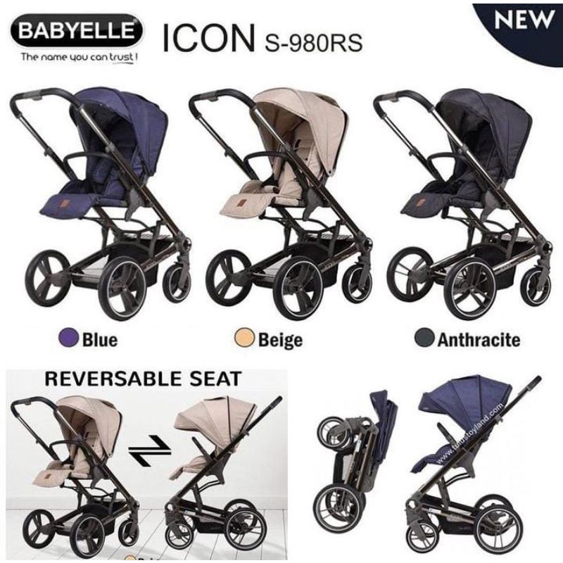RS Baby Elle S980 Kereta Bayi Reversible Bisa Hadap Ibu Stroller Icon S-980RS model Reversible Seat terbaru persembahan dari Babyelle. Rangka Aluminium polish hitam kokoh dan mewah, kain kursi yang tebal dan nyaman untuk bayi. Dilengkapi safety bumper bar yang dapat dilepas pasang dan pegangan dilapisi kulit menambah kesan elegant. Stroller type All Terrain dengan roda besar & rangka kokoh mampu menampung berat Anak hingga 30kg. Roda besar untuk kenyamanan meminimalkan goncangan disetiap medan perjalanan bersama buah hati Anda.