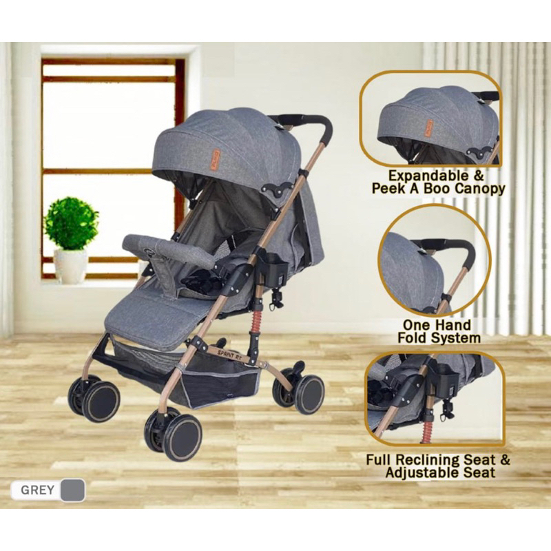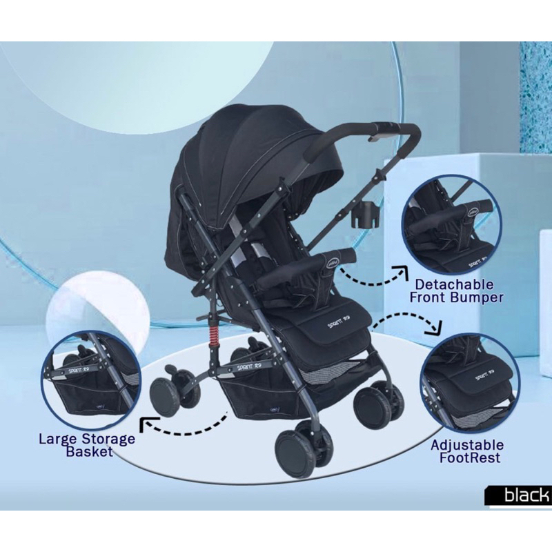 SPRINT RH 389 : Spesifikasi : HANDLE BISA DUA ARAH (hadap ibu dan depan) INCLUDE HEAD PILLOW, MOSQUITO NET One hold fold system (melipat dengan satu tangan) Rangka ringan Terdapat suspensi Akselerasi roda yang mudah didorong dan di belokkan Tempat duduk empuk dan sandaran kaki dapat diatur Sandaran bisa diatur dalam 3 posisi hingga 150 derajat ( tidur, rebah dan duduk ) Sistem keamanan 5 point harness yang nyaman untuk bayi Keranjang belanja yang besar Terdapat kanopi untuk melindungi si kecil dari matahari yang bisa dilipat