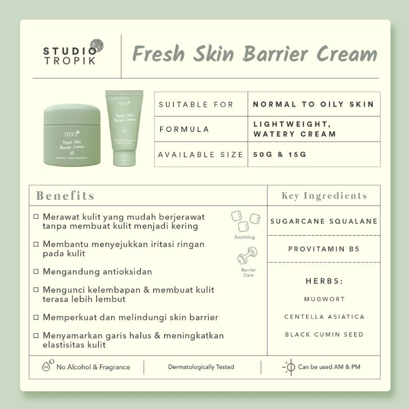 Fresh Skin Barrier Cream mengandung Squalane & Herbs; memiliki tekstur Fresh WaterCream yang cocok digunakan untuk kulit normal - oily & acne prone. Memberikan efek soothing pada kulit wajah.