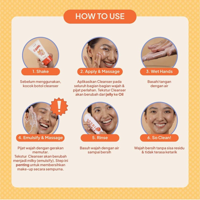 How to use: 1️⃣ Shake: Sebelum menggunakan kocok botol cleanser terlebih dahulu 2️⃣ Apply & Massage: Aplikasikan cleanser pada seluruh bagian wajah & pijat perlahan. Tekstur cleanser akan berubah dari Jelly ke Oil 3️⃣ Wet Hands: Basahi tangan dengan air 4️⃣ Emulsify & Massage: Pijat wajah dengan gerakan memutar. Tekstur cleanser akan berubah menjadi milky (emulsify). Step ini penting untuk membersihkan make-up secara sempurna. 5️⃣ Rinse: Basuh wajah dengan air sampai bersih 6️⃣ So Clean!: Wajah bersih tanpa sisa residu & tidak terasa ketarik
