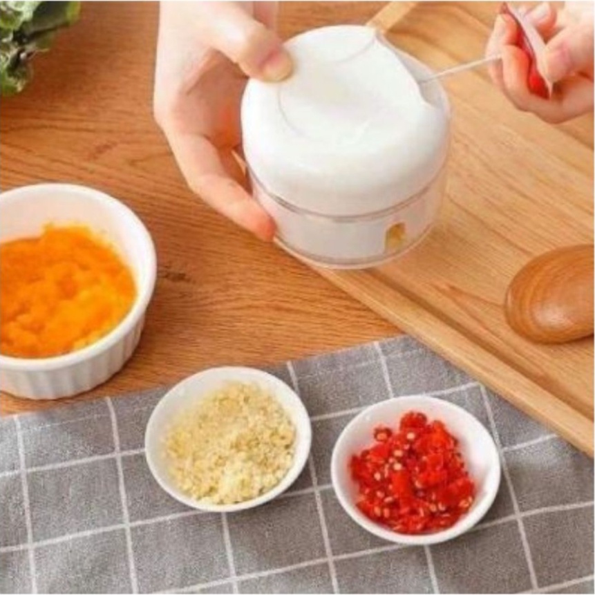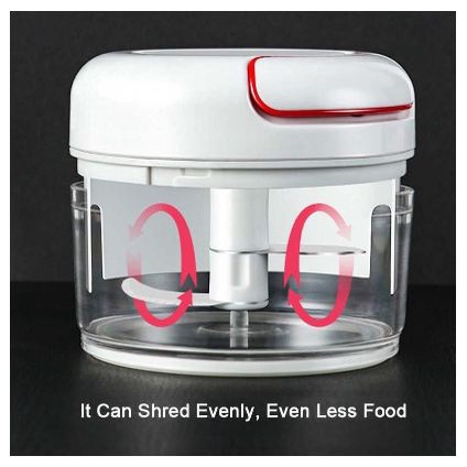 Daging dan sayuran kini dapat Anda cincang dengan sangat mudah, tidak perlu lagi menggunakan pisau yang melelahkan dan memakan waktu lama. Anda hanya perlu menarik tali berulang kali sehingga pisau didalam berputar dan mencacah daging, sayuran, bawang, dll