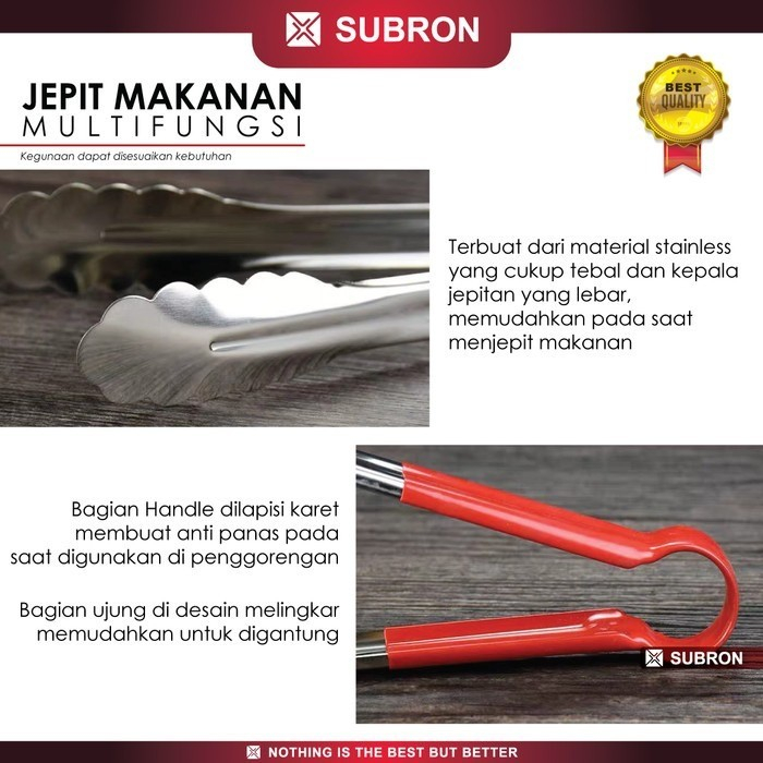 Jepitan terbuat dari bahan material stainless yang cukup tebal dengan kepala jepit yang lebar (3.7cm), mempermudah untuk mengambil makanan. Dilapisi karet pada bagian pegangan dan dengan desain ujung yang bulat memudahkan untuk menggantung jepitan. Terdapat 3 ukuran, silahkan pilih pada bagian varian.