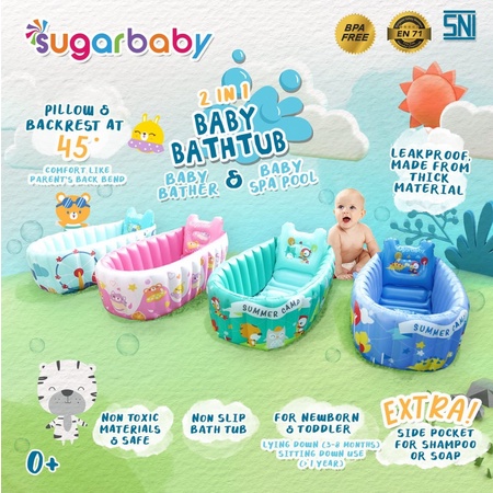 Keunggulan Sugarbaby Inflatable Baby Bath Tub 2in1: 2 Fungsi : Bisa dijadikan Baby Bather (memandikan bayi dengan aman) & Baby Spa Pool (kolam untuk si kecil relax berendam dan bermain) 2 Bathing stages: Lying down ( posisi tiduran untuk bayi 3 - 8 bulan), Sitting down ( posisi duduk untuk anak > 1 tahun) Bahan Non-Toxic PVC yang tebal dan tidak mudah robek/bocor Pillow dan back rest sudut 45⁰ senyaman topangan Ibu/Ayah Desain Non-Slip dengan bantalan Multi Balloon yang aman dan nyaman bagi anak