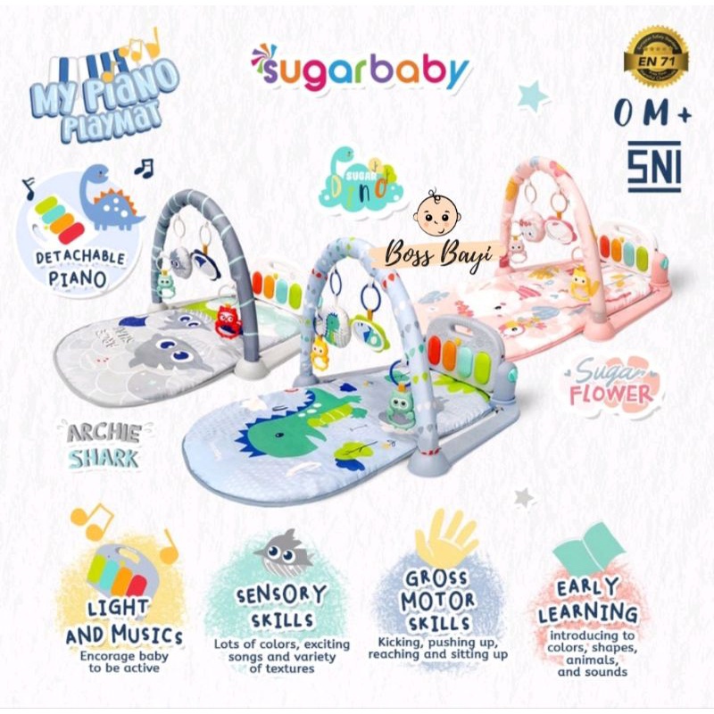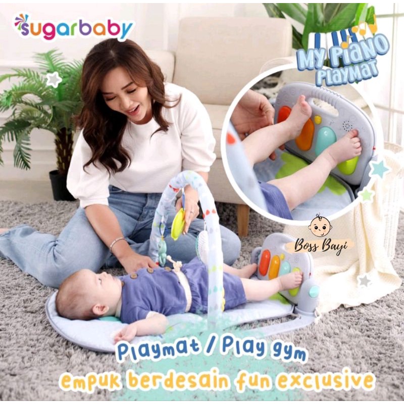 NEW - SUGAR BABY PIANO PLAYMAT: 🔹Piano playmat dapat digunakan 4 tahap untuk bayi bermain: (1) Lay & Play dimana bayi dapat tidur telentang sambil melihat mainan gantung dan mendengarkan music (2) Tummy Time dimana bayi dapat telungkup sambil belajar memperkuat otot leher dan tangannya (3) Sit & Play dimana bayi yang sudah dapat duduk dapat mencoba untuk menekan tombol-tombol piano yang ada (4) Walk & Take Along dimana piano dapat dilepas tersendiri sebagai mainan piano kecil yang dapat dibawa-bawa