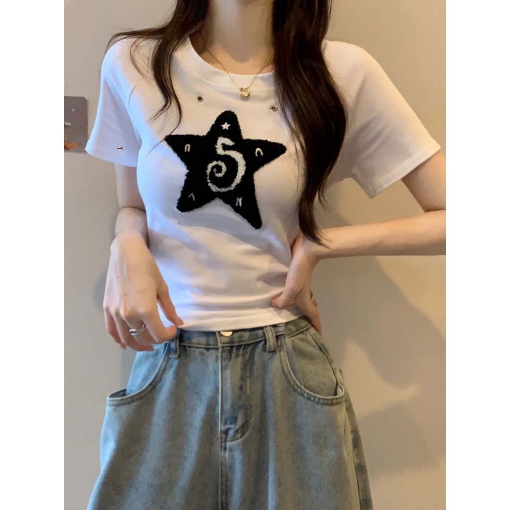 Detail Suhao American Retro Bahu Depan Coklat Lengan Pendek T-shirt Wanita Musim Panas Desain Rasa Niche Chic Slim Fit Ketat Atasan Pendek Kaos Import Wanita Kaos Wanita Gaya Korea Lengan Pendek Kaos Pendek Perempuan