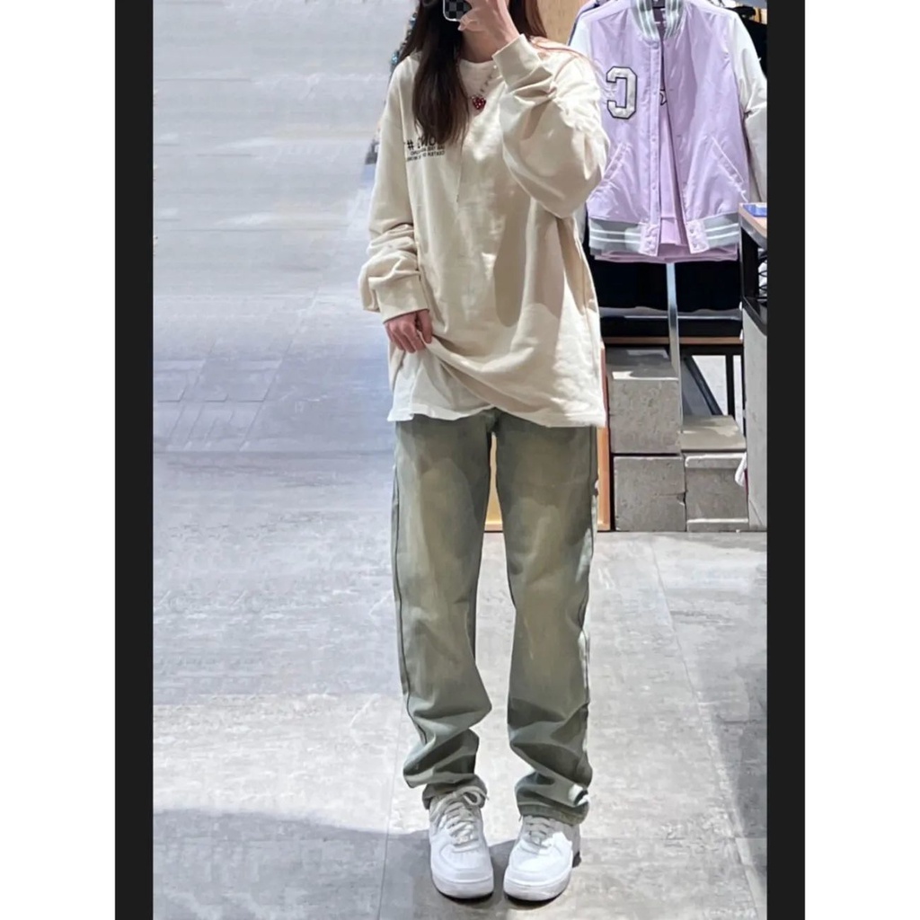 Detail Suhao American retro high street mencuci jeans lurus warna lumpur kuning tua wanita terlihat kurus dan tinggi mengepel celana pasang