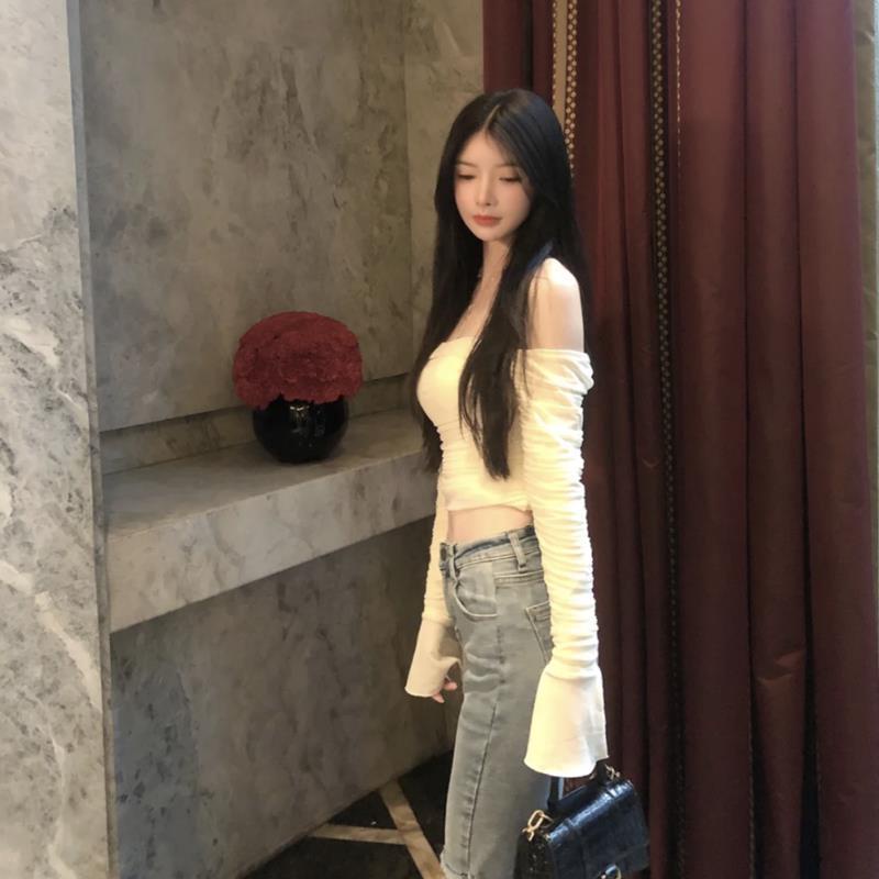 Pakaian Wanita > Atasan > Kaus > ☋☃♨Suhao awal musim semi mesh tipis one-shoulder top wanita 2022 baru susu kuning lipit slim fit lengan terompet t-shirt